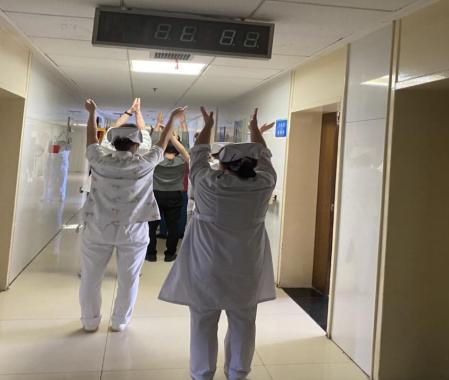 在延安大學咸陽醫院內科樓三樓呼吸與危重癥醫學科走廊上每天下午便會出現一道亮麗的風景線。隨著呼吸操節奏響起,醫護人員和患者整齊排列,個個神清氣爽,隨著領操人員的口令∶“第一節,吸、呼……”一段有助于肺康復訓練,提高呼吸系統功能的健康呼吸操就開始了!領操護士邊示范邊講解道:“吸氣,雙臂上舉,下蹲呼氣……”身后患者和家屬們跟隨著她的動作,邊做操邊調整呼吸。