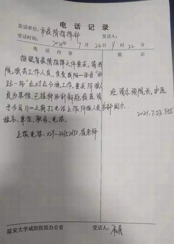 2021年7月23日,延安大學咸陽醫院接到咸陽市疫情指揮部下達的咸陽-西安“兩站一場”點對點疫情管控分流工作指令,我們保障部孫騰飛同志知曉應征消息后,主動請纓,希望能接過英雄的接力棒,代表我們延安大學咸陽醫院出征。