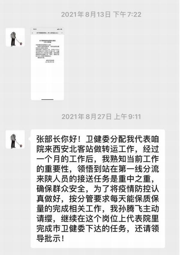 7月31日,孫騰飛同志隨著咸陽市疫情防控隊伍達到省疫情指揮部,被分配到西安高鐵站。孫騰飛積極主動熟悉了解省指揮部部署任務和要求,及時向醫院領導發微信匯報情況,并保證“請領導放心,保證完成任務,不負使命”。他是這樣說的,也是這樣做到了。