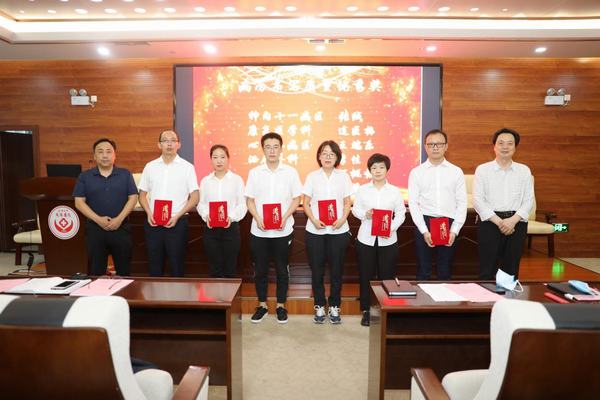 會議第二項由常務副院長姚曉峰宣讀表彰文件,對各分院平均得分排名在榜首的科室提出了表揚,分別是心內二病區、腫瘤內科、神內十一病區、神內二病區、腫瘤胸外科、泌尿外科。張海濤院長與姚曉峰常務副院長一同為獲得“病歷書寫質量優秀獎”醫師頒發榮譽證書,分別是心內二病區王端樂、腫瘤內科馮媛、神內十一病區張絨、康復醫學科連醫梅、泌尿外科李佳、口腔科何桃怡,希望受表彰的優秀醫師充分發揮優秀模范帶頭作用,在今后的工作中做出更好的成績。