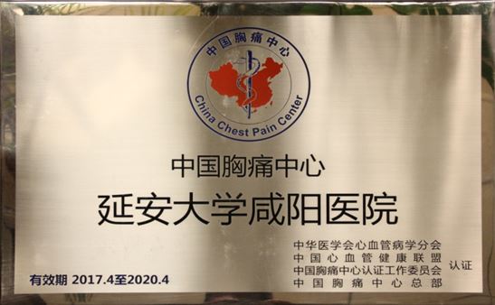 2017年4月6日,中華醫學會心血管分會,中國胸痛中心認證工作委員會,中國胸痛中心總部公告,延安大學咸陽醫院通過2017年第一批中國胸痛中心標準版認證。成為陜西省咸陽市首家獲得國家認證的胸痛中心。