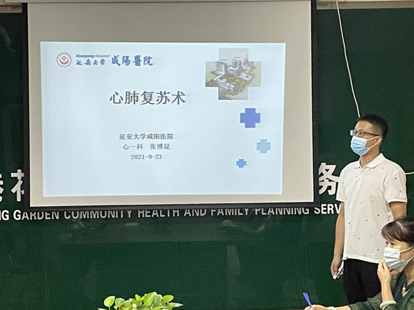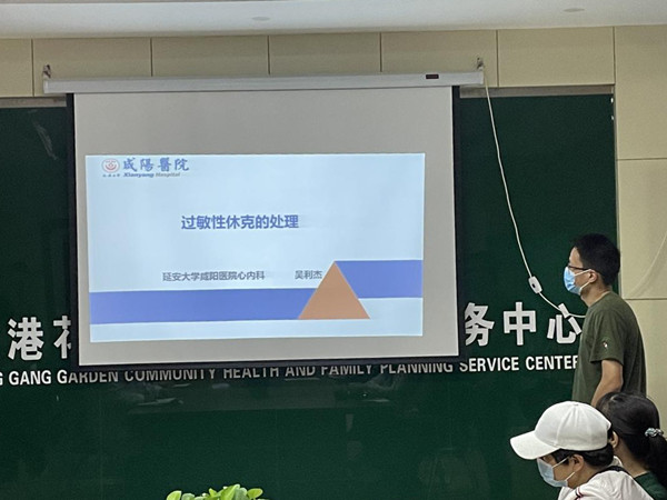 培訓運用多媒體課件,首先由延安大學咸陽醫院心內一病區吳利杰責任總醫師講述了過敏性休克的識別及正確處理,強調了早期識別過敏性休克的重要性,及時正確地處理,防止病情進展,贏得黃金救治時間,改善患者預后。接著張博昆醫生對如何判斷病人心跳呼吸停止、心肺復蘇的指征、操作步驟、救治過程中的注意事項、復蘇成功的標志等進行了詳細的講授和演示,著重強調新的CPR進展、新的五環生存鏈、新的CPR操作順序。