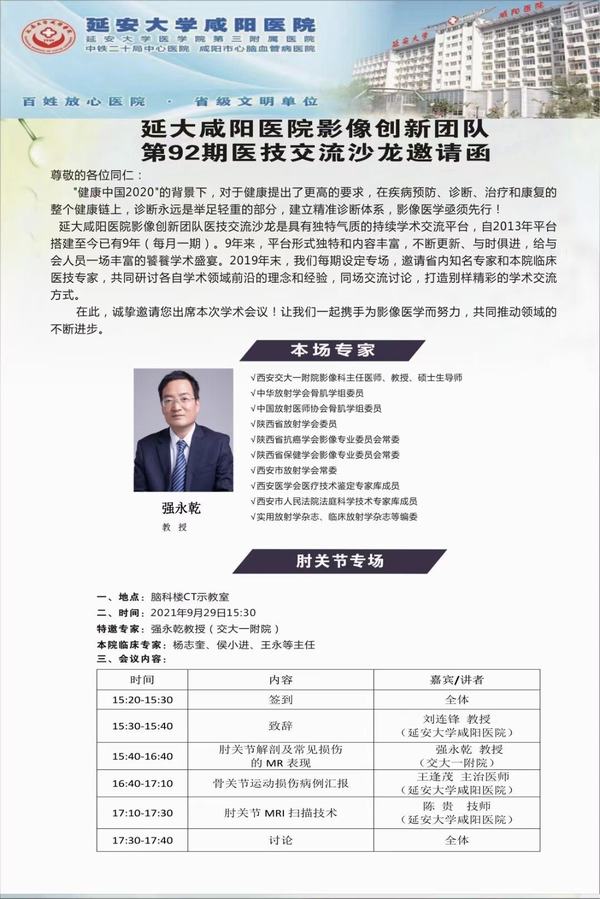 2021年9月29日,延安大學咸陽醫院第92期醫技交流活動在腦科樓CT/MRI示教室成功舉辦,會議由延安大學咸陽醫院院長助理兼醫學影像科主任劉連鋒教授主持,特邀西安交大一附院強永乾教授及我院疼痛科王永主任、骨二科侯曉進主任、骨二科曹熙責任總醫師等臨床專家參加本次活動,我院影像及臨床醫、技、護共40余人參加了本次會議。