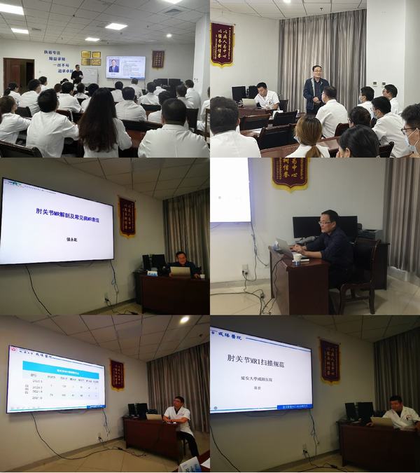 下午3點30分,會議正式開始,經過劉連鋒教授隆重介紹后,西安交大一附院強永乾教授以《肘關節解剖與常見損傷的MR表現》為題進行講授,在“5條肌腱、4條韌帶、3條神經”等解剖方面的詳細講解讓與會人員對于肘關節解剖有了更加深刻的印象,并涵蓋MR的各種掃描參數、角度,展示了強教授扎實的影像基本功和豐富的臨床經驗,隨后強教授通過肘關節臨床常見疾病的MR圖像,向大家進行了展示,如骨挫傷、隱匿性骨折、關節軟骨骨折、韌帶及肌腱損傷、骨性關節炎等,強教授循循善誘,字字珠璣,充分調動了在場聽眾的學習興趣。本次授課讓與會臨床及醫技人員對肘關節解剖及常見病例有了更清晰和深刻的認識,鞏固基礎、開闊視野,對我院肘關節及肘部疾病影像診斷水平的提高有很大幫助。