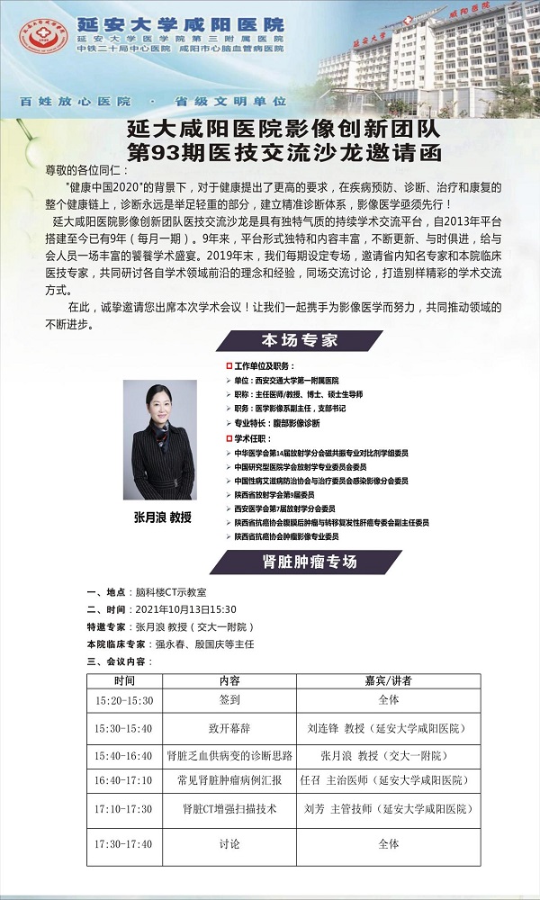 2021年10月13日,延安大學咸陽醫院第93期醫技交流活動在腦科樓CT/MRI示教室成功舉辦,會議由延安大學咸陽醫院院長助理兼醫學影像科主任劉連鋒教授主持,特邀西安交大一附院張月浪教授前來授課指導,我院泌尿外科強永春主任、腫瘤內科殷國慶主任、劉玉龍醫師等臨床專家參加本次活動,我院影像及臨床醫、技、護共40余人參加了本次會議。
