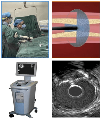 IVUS是指無創性超聲技術和有創性導管技術結合,使用末端鏈接有超聲探針的特殊導管進行醫學成像技術。血管內超聲是通過心導管將微型化的換能器置入血管腔內,顯示血管斷面形態及血流圖形、血管狹窄程度、血管管壁厚度,這樣綜合性判斷血管到底病變到什么程度,精確是否需要進行介入手術干預。