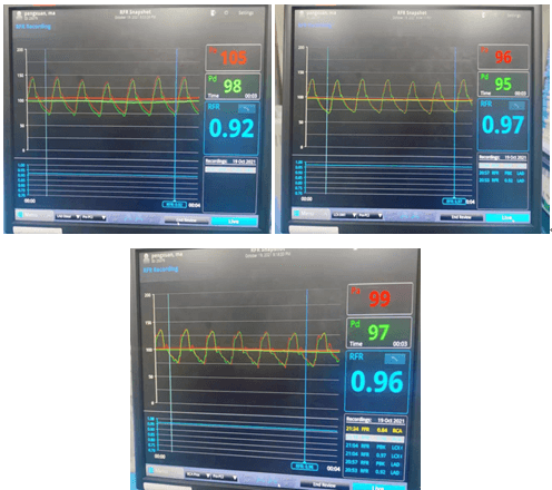 造影結果右冠多處狹窄約70-90%,左冠也是多處70-80%狹窄;對于這樣一個結果,是這些狹窄造成的胸悶、心悸嗎?這些病變需不需要都給予介入處理呢?一根血管植入支架還是三根血管都需要植入支架?心內九科崔旭輝主任帶領介入醫生團隊討論后,決定進行RFR檢查給出一個明確的答案。所以經過與患者及其家屬溝通后選擇進行RFR檢測,結果如下圖: