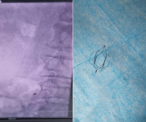 術后繼續積極治療,再未出現過暈厥的情況,入院時的癥狀均得到了改善,嚴密監測了患者下肢靜脈血栓,在治療1周后復查超聲檢查提示下肢深靜脈新鮮血栓的影子已經消失。傳統的治療方案到此已經獲得了滿意的療效。但崔主任從患者長期預后的角度考慮,濾器遺留在血管里,存在其他不可預知的風險,并需要長期口服抗凝藥物預防血栓的形成,這樣也增加了消化道、眼底、腦血管等出血的風險。于是崔主任帶領團隊,為患者實施了經皮深靜脈濾器取出術,極大的避免了不良事件發生的機率。