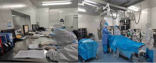 “您好!這邊是腦病急診科,20分鐘左右上來一位急性腦梗死患者,曾在中高風險區醫院就診過,目前急診核酸結果未出,病情危急,需急診進行介入手術。”“好的,收到!”急診綠色通道,介入室啟動。手術間備用狀態,參與手術人員進入三級防護狀態,1名護士及1名技師立即疏散其它人員,1名護士就位病員通道等候患者形成閉環通道,手術醫生從員工通道進入,所有參與手術的工作人員10分鐘之內準備就緒!