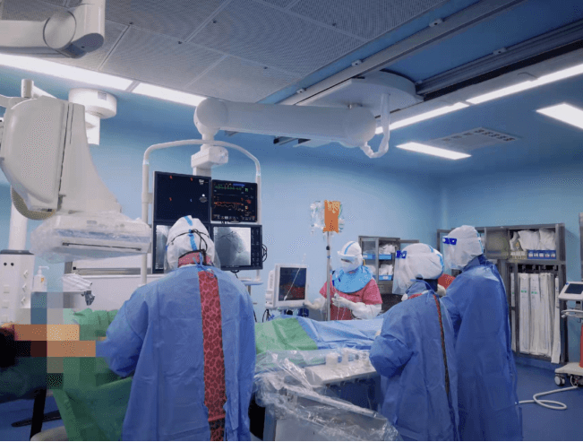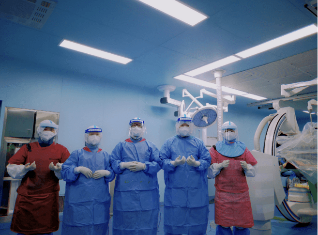 3月13日上午,在心血管病院吳棟梁院長組織和指導(dǎo)下,后勤保障部設(shè)立專用通道、蔡萍主任介入團(tuán)隊(duì)在高愛倩、姚姬花、張娜護(hù)師及孔飛技師等各位同仁的全力配合下,在獨(dú)立系統(tǒng)百級層流凈化手術(shù)間,為患者實(shí)施了冠脈造影術(shù)及支架植入術(shù)。介入手術(shù)具有特殊性,微創(chuàng)的優(yōu)勢取決于放射性儀器的運(yùn)用,在射線下進(jìn)行操作,術(shù)者及配臺(tái)護(hù)士均要穿戴大概30多斤重的防護(hù)鉛衣、鉛圍脖、鉛帽、鉛眼鏡、無菌一次性手術(shù)衣。而為封控期間的患者進(jìn)行手術(shù),醫(yī)務(wù)人員按照防控規(guī)范要求需再穿上防護(hù)服、面屏、靴套等。為了減少感染機(jī)會(huì)他們穿上尿不濕,數(shù)層緊密包裹,悶熱與負(fù)重程度增加了數(shù)倍,同時(shí),多層橡膠手套對于精細(xì)的介入操作也帶來了很大的挑戰(zhàn)。為了確保患者的生命安全、減少患者的病痛,當(dāng)天為7名患者進(jìn)行了心臟介入手術(shù),手術(shù)時(shí)間持續(xù)8小時(shí)之久,全程白衣鎧甲均是站立姿勢。他們用汗水和責(zé)任,用仁心與擔(dān)當(dāng),捍衛(wèi)了患者生命安全。術(shù)后按照《新冠肺炎防控方案第八版》對介入導(dǎo)管室、專用通道等進(jìn)行終末消殺。