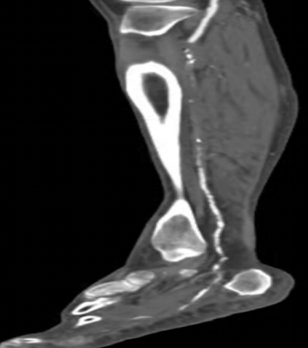 情急之下去了當地醫院,醫生一瞧告訴王大伯:“您這可能是糖尿病足,你這傷口肯定是長不好了,需要外科手術清創、植皮,如果還是長不好就要截肢”。聽了醫生的話,王大伯出了一身冷汗,幾經周折最終來到了我院血液內分泌科,住院后進行下肢動脈超聲及CTA發現:雙下肢膝下動脈節段性狹窄、閉塞。診斷為:右下肢動脈硬化閉塞癥(Runtherford6級),糖尿病下肢嚴重缺血(右側),右足潰瘍;經多學科會診初期"改善循環、控制血糖、抗感染、局部清創換藥、營養神經、支持治療"六環法措施下,老伯潰瘍雖有好轉,但仍不能完全愈合,右足仍靜息下疼痛。