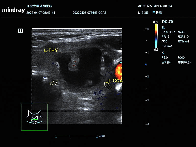 王女士在半年前因頸部包塊就診于我院,超聲提示甲狀腺左葉囊實性包塊,因疫情原因未進一步治療;近半年來包塊明顯增大,頸部膨隆,為進一步治療就診于我院血液內(nèi)分泌科。彩超診斷為甲狀腺左側(cè)葉囊實性結(jié)節(jié),患者因懼怕疼痛,不愿手術(shù),選擇保守治療;后得知甲狀腺結(jié)節(jié)可以超聲引導(dǎo)下微創(chuàng)治療,遂聯(lián)系超聲科進行咨詢;超聲科醫(yī)生對王女士的甲狀腺結(jié)節(jié)進行評估后,就射頻消融術(shù)的優(yōu)點、術(shù)前的準(zhǔn)備、術(shù)中的風(fēng)險、術(shù)后的注意事項詳細(xì)講解,王女士當(dāng)即決定選擇射頻消融術(shù)治療甲狀腺結(jié)節(jié)。4月9日下午在介入超聲手術(shù)室順利完成手術(shù),術(shù)后頸部僅一個針眼大小。術(shù)中囊性部分抽吸為黑紅色粘稠液,實性部分消融治療,術(shù)后即刻造影結(jié)節(jié)內(nèi)未見造影劑回聲。