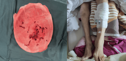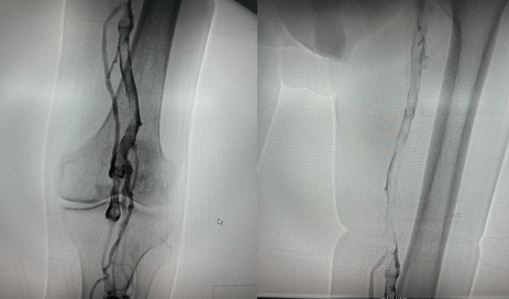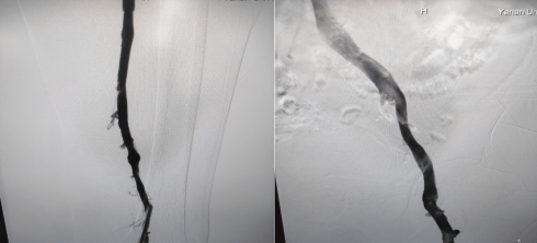 術中造影左下肢股靜脈、腘靜脈大量血栓形成