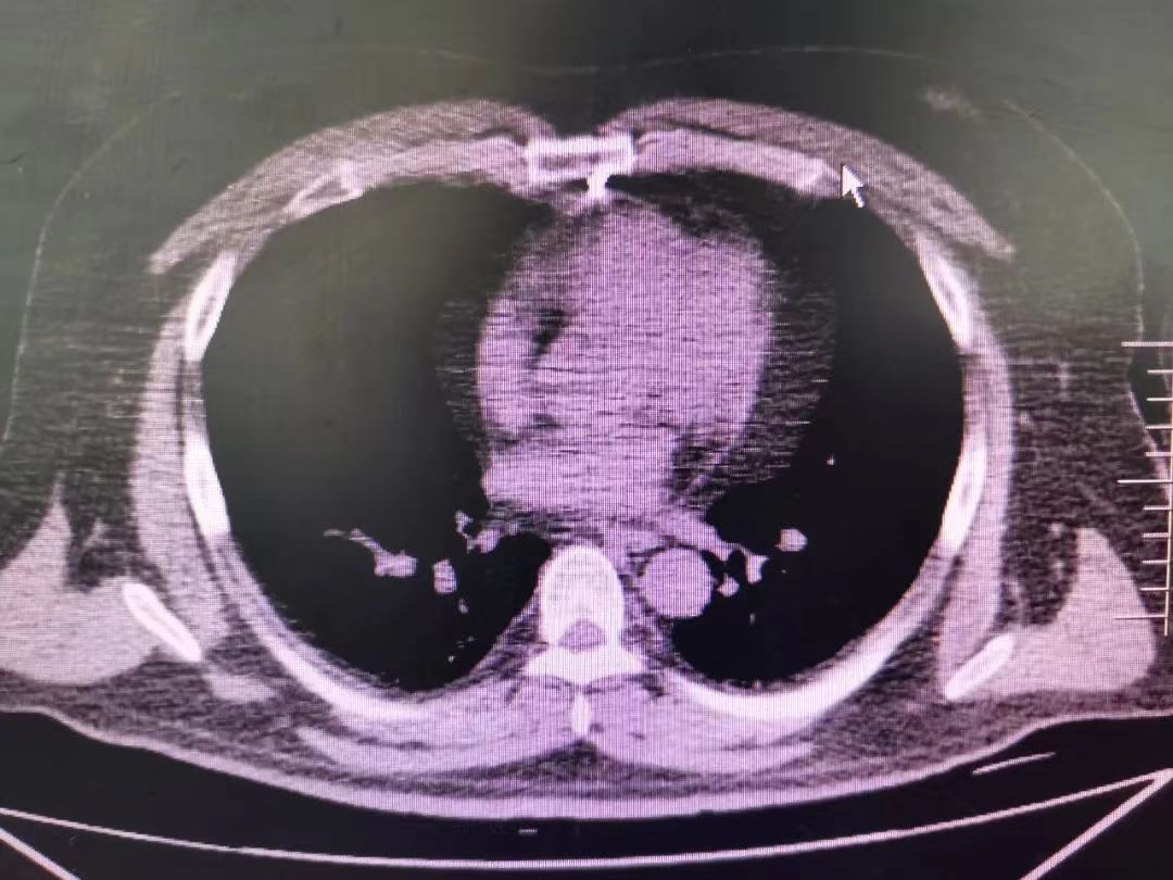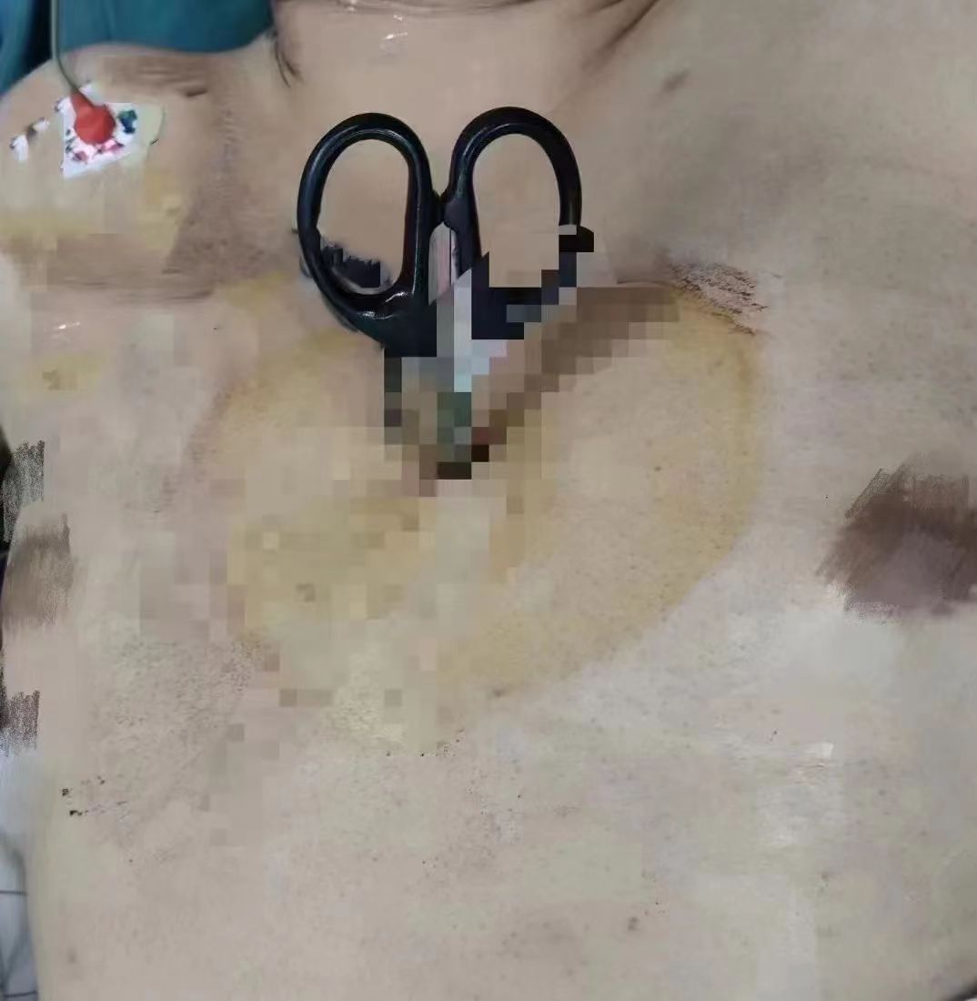 查看病人病情及CT后,考慮到刀尖離心臟較近,隨時有加重損傷的可能,武小剛主任當機立斷,將拔了剪刀向外拔出約5mm,局部固定,避免遂呼吸或搬動患者造成進一步損傷心臟。因患者病情特殊,術前、術中不可預知風險較多,武小剛主任與麻醉科醫師溝通后,分析病情:“手術患者剪刀斜著刺入,有損傷肋間及乳內動脈可能,故需全麻下手術拔除,萬一已傷到胸壁血管,那就需要開胸止血,否則大出血會導致患者休克而死亡;如拔出后出血少,動態觀察后可不劈開胸骨,減少了對患者更大的損傷,也能保住患者的生命,其次手術需打破傷風抗毒素及預防使用抗生素,減少術后感染的風險”。術中,對插入剪刀周圍進行嚴格消毒,徹底游離周圍組織,避免出血而無法準確定位止血,隨后小心翼翼的將剪刀拔除,骨面可見少量出血,觀察半小時未見明顯出血,血壓平穩,手術順利,這才松了口氣。術后1小時左右患者清醒,哽咽著對武主任及科室醫護人員說:“謝謝醫生,謝謝你們,真的,真的太感謝了,不瞞您說,后事我已經跟家人交代過了……”。武主任輕拉患者的手說:“你真是不幸中的萬幸啊,差一點你就沒機會來醫院了,也別緊張了,再恢復恢復就回家,以后多注意”。術后監測生命體征,第二天拔除引流管,按時換藥,復查心臟彩超、胸部CT,未見異常于1周后痊愈出院。