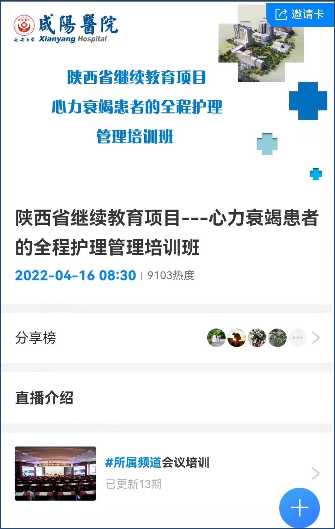2022年4月16日,由延安大學(xué)咸陽(yáng)醫(yī)院主辦的陜西省繼續(xù)醫(yī)學(xué)教育項(xiàng)目——“心力衰竭患者的全程護(hù)理管理培訓(xùn)班” 在我院隆重召開。延安大學(xué)咸陽(yáng)醫(yī)院張海濤院長(zhǎng)、延安大學(xué)咸陽(yáng)醫(yī)院科研教學(xué)管理中心韓曉芳主任、延安大學(xué)咸陽(yáng)醫(yī)院心血管內(nèi)科VIP病區(qū)王顯利主任、延安大學(xué)咸陽(yáng)醫(yī)院護(hù)理部楊敏主任、延安大學(xué)咸陽(yáng)醫(yī)院心血管病院黨文婷總護(hù)士長(zhǎng)、延安大學(xué)咸陽(yáng)醫(yī)院外科病院王長(zhǎng)寧總護(hù)士長(zhǎng)、延安大學(xué)咸陽(yáng)醫(yī)院腦科病院宋春蘭總護(hù)士長(zhǎng)出席開幕式。受疫情影響,本次會(huì)議采取線上授課,邀請(qǐng)了多名國(guó)內(nèi)護(hù)理專家授課,線上參會(huì)人數(shù)達(dá)9000余人。