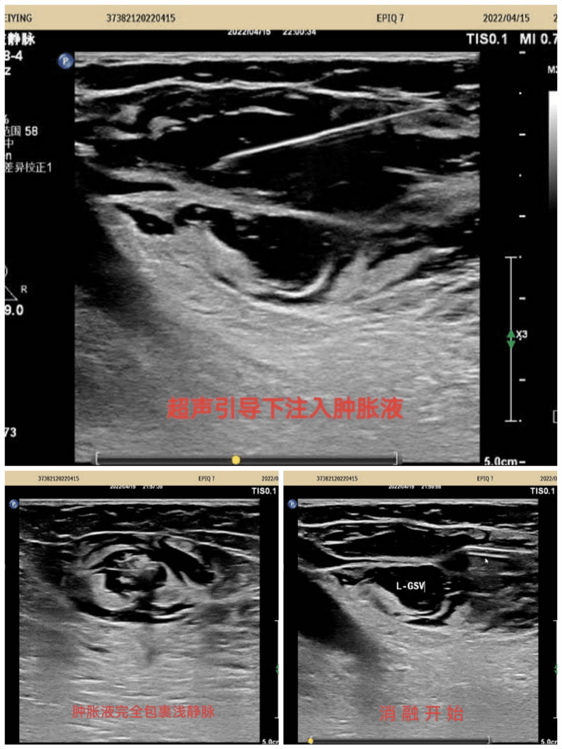 超聲引導下標記大隱靜脈及曲張靜脈部位走行,體表投影部位標記,在彩色多普勒超聲靜脈模式引導下實時監(jiān)測,確定穿刺點,局麻下穿刺進針,確定穿刺成功后置入導絲,拔除穿刺針并沿導絲置入7F鞘管,拔出導絲,沿鞘管將消融電極置入要消融的大隱靜脈主干內(nèi),注入腫脹麻醉液,確認大隱脈閉合,開啟移動射頻消融導管,消融完畢后拔除鞘管及射頻導管再次超聲探查隱股靜脈交界處,確定無血栓形成。
