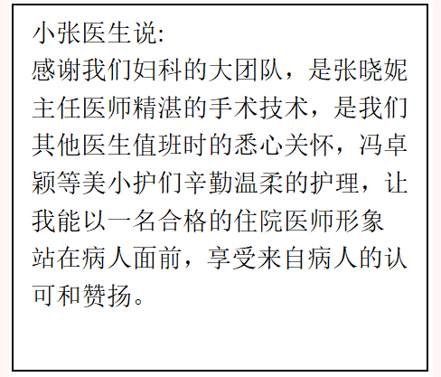 五病室的2位患者都是這天入院的,其中10床是外陰腫瘤患者,入院后很快就進(jìn)行了手術(shù),手術(shù)順利。因傷口位置特殊,很容易感染,所以術(shù)后需要勤換藥,甚至1天多次消毒抹藥,張醫(yī)生一天不落,傷口沒有感染,意料之中長好了;11床則是宮頸高級別上皮內(nèi)病變,因?yàn)槭前┣安∽儯∪耸謸?dān)憂,常常一個(gè)問題反復(fù)問很多遍,張楊杰醫(yī)生也是不厭其煩地盡可能解釋病情。她們說“小張醫(yī)生就像不用休息一樣,怎么一直都有耐心,每次來查房的時(shí)候,就感覺開心了,心里也覺得安心得多。”