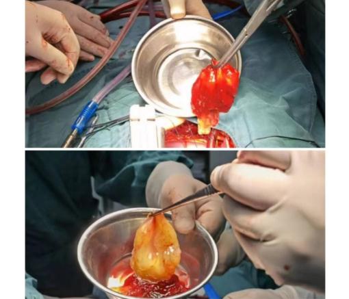 劉先生經檢查顱腦CT未見腦梗塞病灶,全面評估后,無手術禁忌,入院后第三天安排手術治療,經過心外科武小剛主任為核心的心外科團隊積極配合,手術全程2.5小時,術中完整取出巨大膠凍樣瘤體組織2枚,經病理檢查提示:“粘液瘤組織伴出血、壞死”。術后在醫護精心的護理下患者恢復良好,于術后第8天痊愈出院,咳嗽癥狀完全消失。