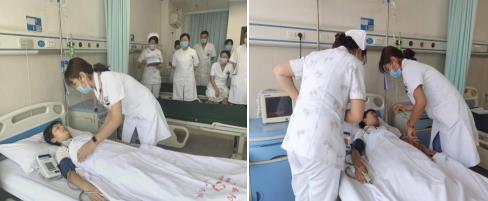 模擬情景:值班護士在巡視病房時發現患者在輸注液體過程中出現全身不自主抖動,面色蒼白,呼吸急促,立即關閉輸液器、更換為鹽水,通知值班醫生查看患者,呼叫護理組成員協助搶救,并快速測量生命體征。患者呼吸26次/分,心率86次/分,血壓80/50mmHg,意識清楚,煩躁,面色蒼白,出汗,聲音嘶啞,呼吸困難。值班醫生迅速查看患者,結合病史和體征,考慮過敏性休克、喉頭水腫可能,立即啟動過敏性休克應急預案:立即給予腎上腺素肌肉注射、吸氧、心電監護、氫化可的松靜脈注射、迅速開通第二靜脈通路擴容等抗休克抗過敏等應急處置;及時通知聯系相關科室進行會診協助診治以及通知上級醫生、科主任和護士長。在緊急搶救約10分鐘后,患者生命體征平穩。搶救完成后向患者及家屬告知病情及注意事項,并按照相關流程積極完善相關上報和記錄內容。
