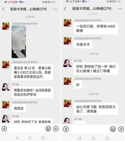 征得家屬同意后,于09:26涇陽縣醫院胸痛中心尹夢肖主治醫師及張陽陽護士乘坐救護車護送患者前往區域協同救治單位-延安大學咸陽醫院。出發前已將患者信息及病情發送至延安大學咸陽醫院胸痛區域協同救治微信群中,延安大學咸陽醫院胸痛中心楊飛娟主治醫師收到信息后第一時間通知導管室及CCU做好接診準備。