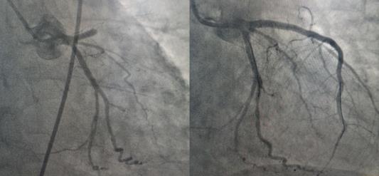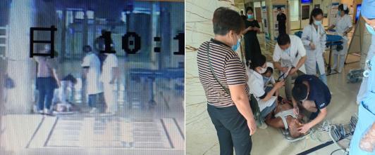 10:10患者到達延安大學咸陽醫院,剛將患者從救護車推下進入門診大廳,患者突然出現意識喪失,觸摸大動脈搏動消失,心電監護提示室性心動過速,危急時刻,延安大學咸陽醫院胸痛中心楊飛娟主治醫師、謝昕護士、王丹丹護士協同涇陽縣醫院尹夢肖主治醫師、張陽陽護士立即就地搶救,門診梁田副主任醫師及胸痛中心二線李新國主任也聞訊趕來支援。經過3次電除顫及胸外按壓后患者恢復竇性心律,意識好轉。在場醫務人員立即將患者送至導管室,實施急診PCI,于10:57開通閉塞血管,恢復血流,將危在旦夕的夏大叔從鬼門關搶救回來。目前患者正在進一步康復中。