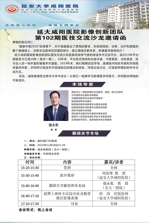 2022年11月30日,延安大學咸陽醫院第102期“醫技交流沙龍”活動在腦科樓CT/MRI示教室成功舉辦,會議由延安大學咸陽醫院院長助理兼醫學影像科主任劉連鋒教授主持,特邀西安交通大學第一附屬醫院強永乾教授線上遠程授課指導,我院口腔科韋彥鋒主任等臨床、影像專家及醫、技、護共40余人參加了本次會議。