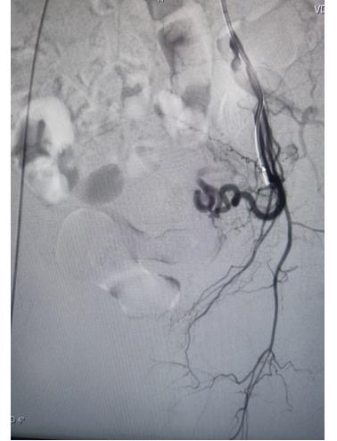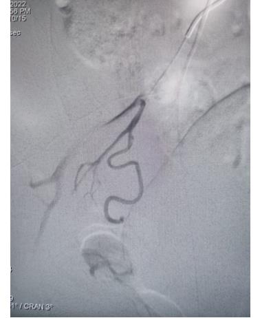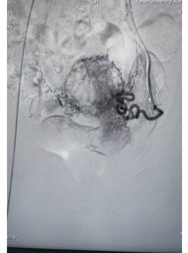 子宮動脈栓塞術屬于血管介入性治療,方法是于股動脈穿刺進針插入導管,在X射線造影下定位進入兩側子宮動脈,注入栓塞劑完全栓塞子宮動脈,從而達到止血或讓子宮肌瘤和病灶缺血壞死的目的;2022年12月6日,在崔旭輝主任、孟慶槐副主任醫(yī)師、馬力主治醫(yī)師等我院介入團隊協(xié)作下,成功為患者進行了雙側子宮動脈栓塞術,術后患者子宮異常出血停止,效果立竿見影,患者病情恢復良好。