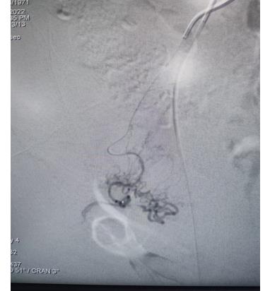 但患者還有子宮肌瘤長年不規(guī)則出血,支架術后需要抗凝、抗血小板聚集治療,這樣加重了子宮異常出血;半年前患者因長期子宮出血不止導致重度貧血進行輸血治療,為此患者痛苦不堪;經過詳細檢查患者合并有子宮肌瘤,經過崔旭輝主任認真研判,考慮絕經期女性,該患者目前最佳選擇是行子宮動脈栓塞術。
