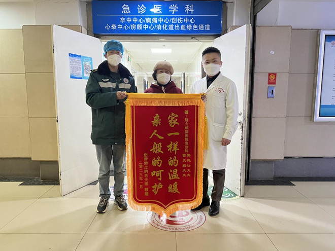 患者家屬介紹說,她老伴今年71歲,1月1日凌晨,突然發熱伴抽搐,六神無主的她隨即撥通了我院急救電話,接線員在接到電話詢問病情后,立即通知出診人員,并給予急救指導、安撫家屬情緒。樊醫生、雷護士第一時間趕到患者家中,評估后見病情危重,現場立即給予吸氧、監護、建立靜脈通路、吸痰、對癥處理等救治措施,待病人癥狀緩解后,在駕駛員的協助下用擔架將患者抬至救護車上,安全轉運至醫院。到院后醫護陪同患者做相關檢查,直至患者安全順利收住專科治療。經過住院后精心治療,現患者已痊愈出院。