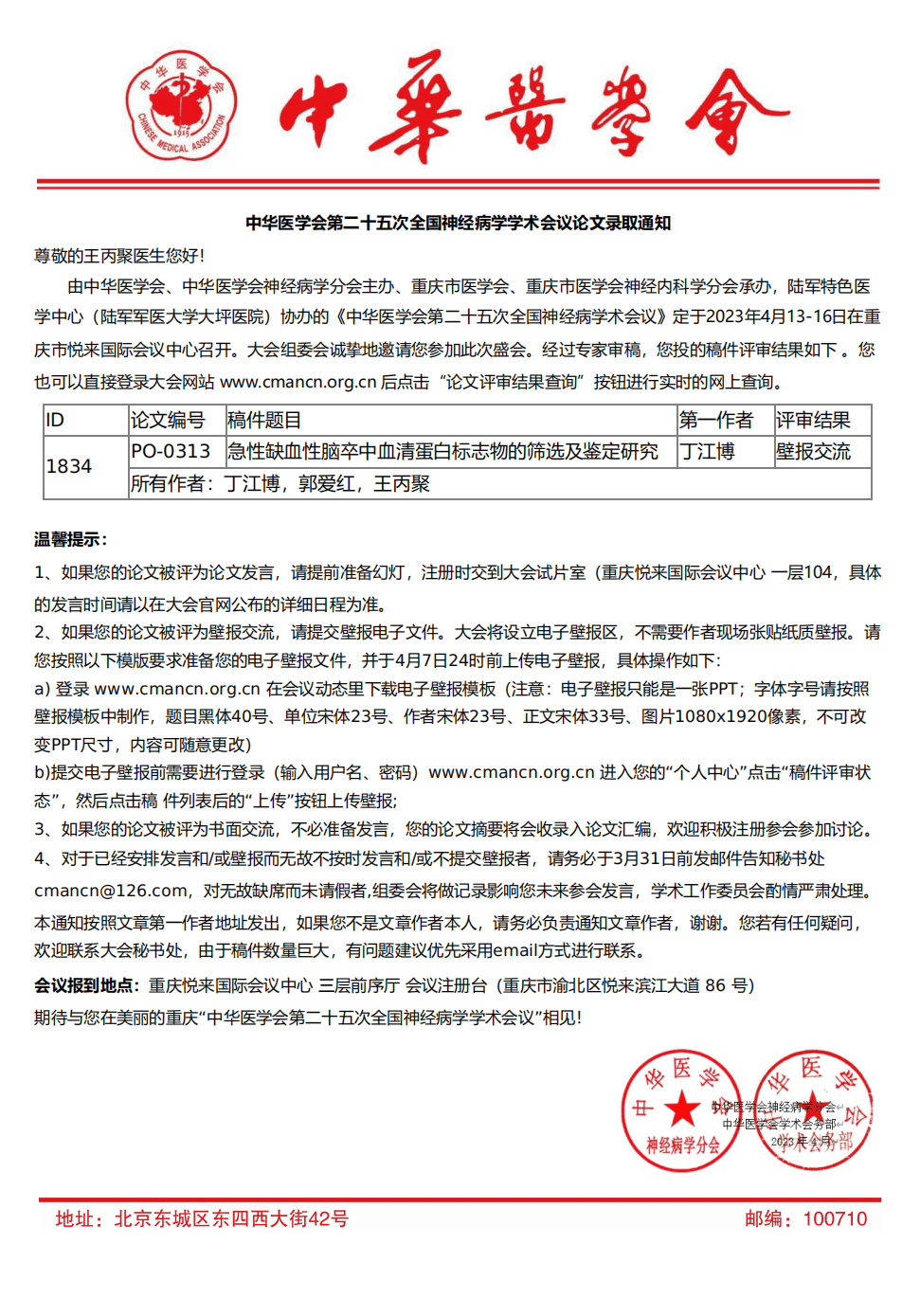 熱烈祝賀我院黨委書記王丙聚同志作為通訊作者發表的論文被推選為中華醫學會第二十五次全國神經病學學術會議壁報交流!