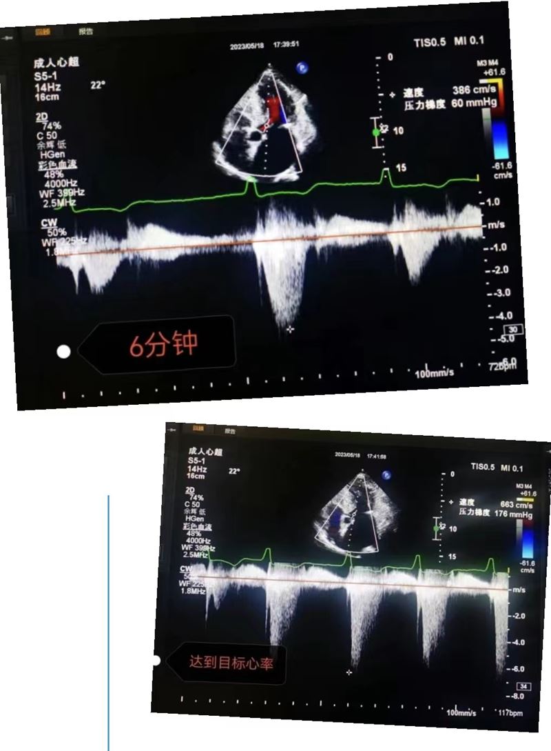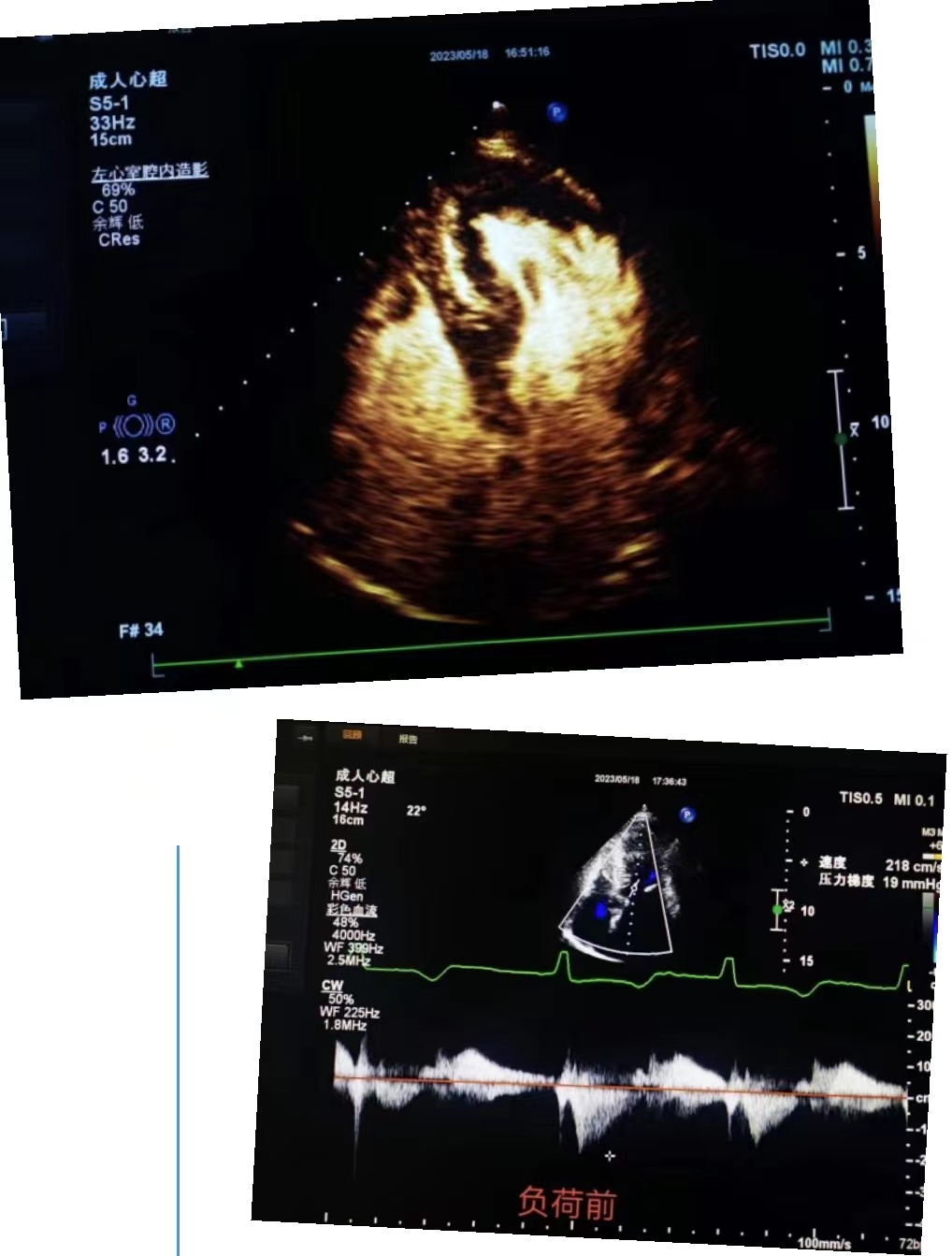 超聲科王英莉主任及心血管組賈貝主治醫師、陳輝主管護師及牛丹青護師為該患者行藥物負荷超聲心動圖。監護儀、急救車到位,常規經胸超聲心動圖提示室間隔增厚,左室流出道血流速度略增快,左心腔超聲造影,可清晰顯示室壁顯著增厚,符合肥厚型心肌病表現,隨后又進行了多巴酚丁胺負荷超聲心動圖,靜息狀態下顯示左室流出道血流速度V:207cm/s,PG:17mmHg;3分鐘后心率達75次/分,左室流出道血流速度V:218cm/s,PG:19mmHg;6分鐘后心率達94次/分,左室流出道血流速度V:386cm/s,PG:60mmHg;9分鐘后達到目標心率,左室流出道血流速度V:649cm/s,PG:169mmHg,停止用藥,藥物負荷試驗陽性,檢查過程中患者無不適癥狀,最終診斷為隱匿性肥厚型梗阻性心肌病。