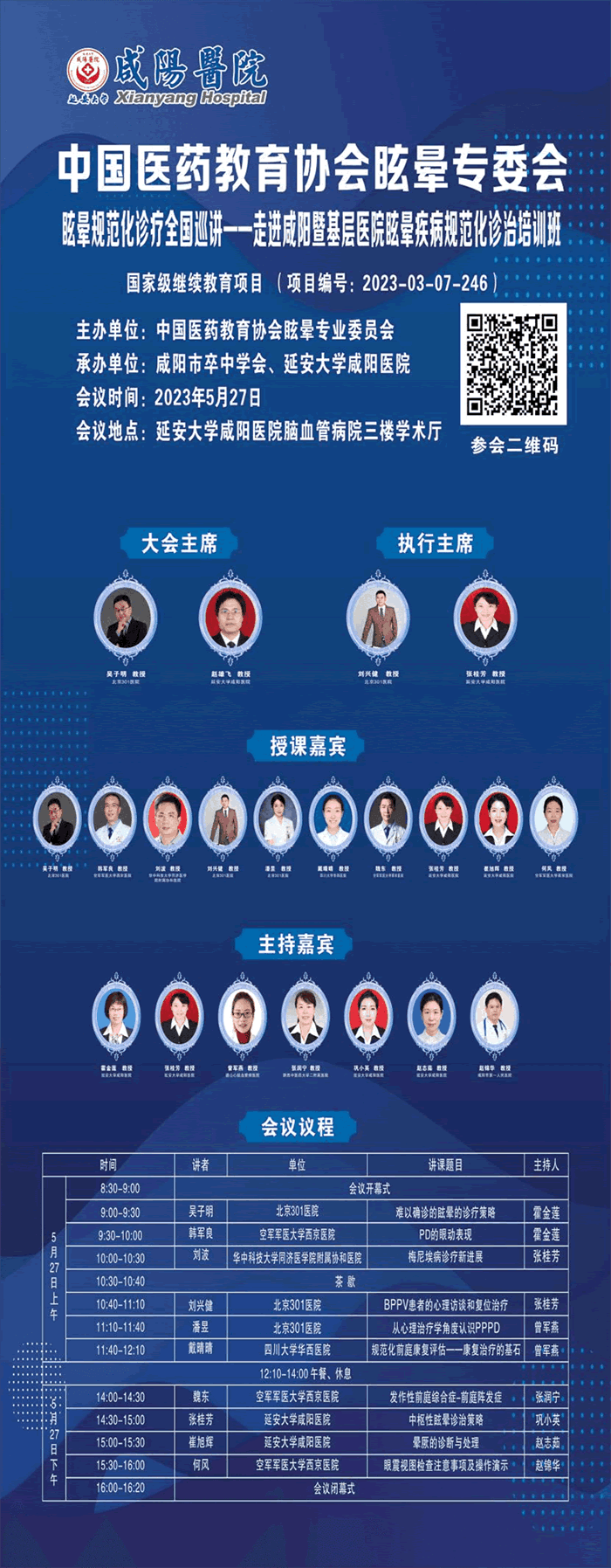 2023年5月26-27日,由中國醫(yī)藥教育協(xié)會(huì)主辦、中國醫(yī)藥教育協(xié)會(huì)眩暈專業(yè)委員會(huì)、咸陽市卒中學(xué)會(huì)、延安大學(xué)咸陽醫(yī)院承辦的中國醫(yī)藥教育協(xié)會(huì)眩暈專委會(huì)眩暈規(guī)范化診療全國巡講——走進(jìn)咸陽在延安大學(xué)咸陽醫(yī)院隆重舉辦。巡講同時(shí)進(jìn)行了中國醫(yī)藥教育協(xié)會(huì)眩暈專家工作站授牌儀式。