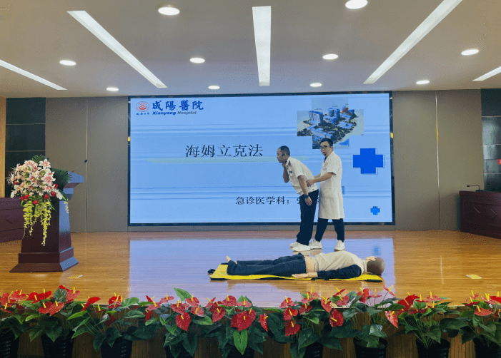 活動現場:延安大學咸陽醫院急診醫學科張彥醫師、張浩護師通過理論知識結合動畫視頻,給全體師生講解了單人徒手心肺復蘇知識。隨后,通過急診醫學科醫護人員的現場示范,生動形象的再一次展現了心肺復蘇:“一看、二判、三掃視、四呼、五定、六壓胸、七開、八吹、九檢查”的相關要領。