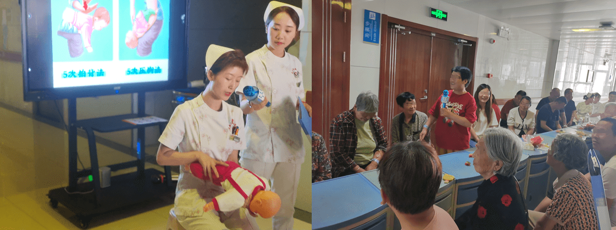 主持人陳雯護士組織大家一同觀看了《預防跌倒小視頻》,著重講解了跌倒的危害、預防措施以及跌倒不能避免時如何正確減少身體的二次傷害;宋彤玫護師由一個小孩誤食異物的視頻為引,向大家演示海姆立克急救法,并與現場人員互動、指導正確的急救動作,從而提高患者居家急救意識及應對方法,為自己及他人的生命安全提供保障。患者認真學習并積極搶答,現場氣氛非常熱烈。