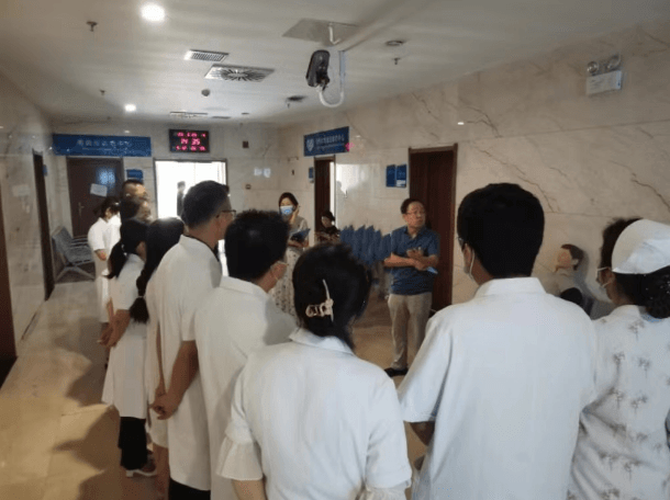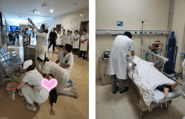接下來進行了門診患者猝死的應急演練。演練采取角色扮演的方式進行,模擬患者在候診區突然倒地,從意識判斷、啟動急救反應系統CPR,再到心電監測、電除顫、液體通路建立,短短的十幾分鐘內,到場的醫護人員快速處置、密切配合,整個急救過程中環環相扣,上演了一場“生死時速”。