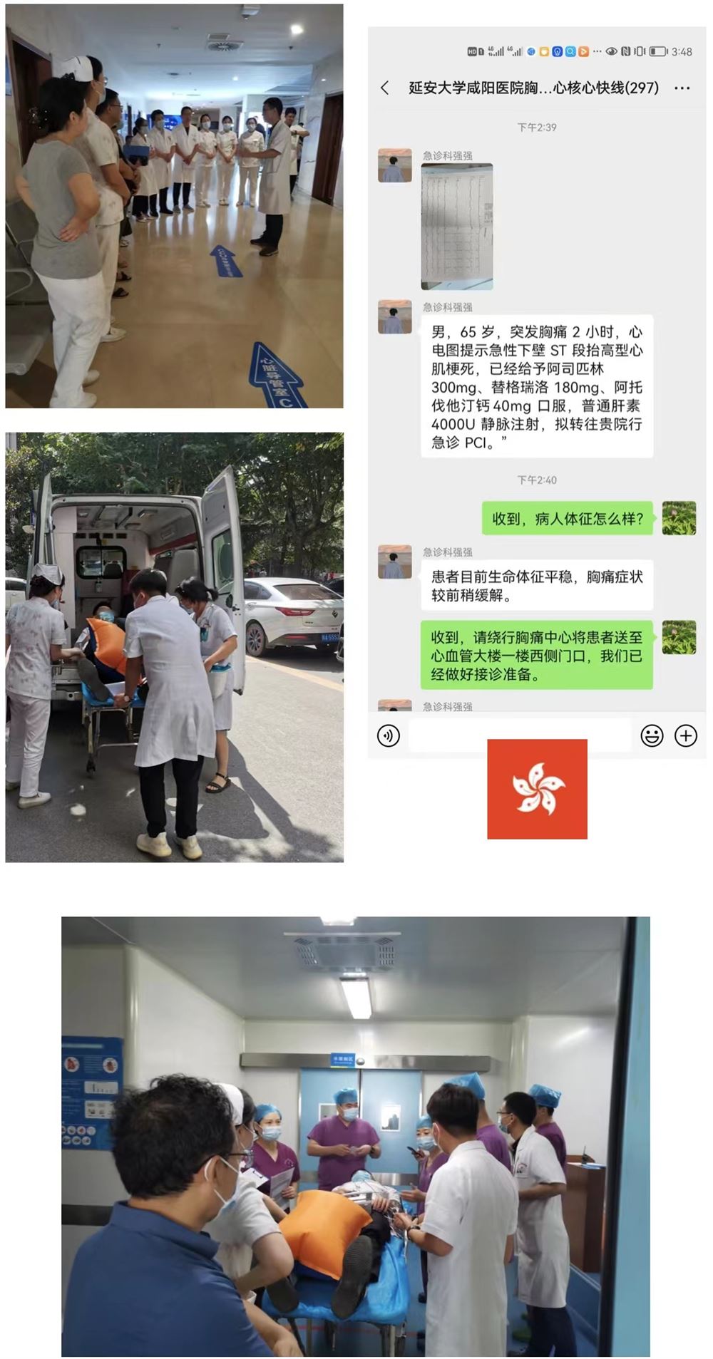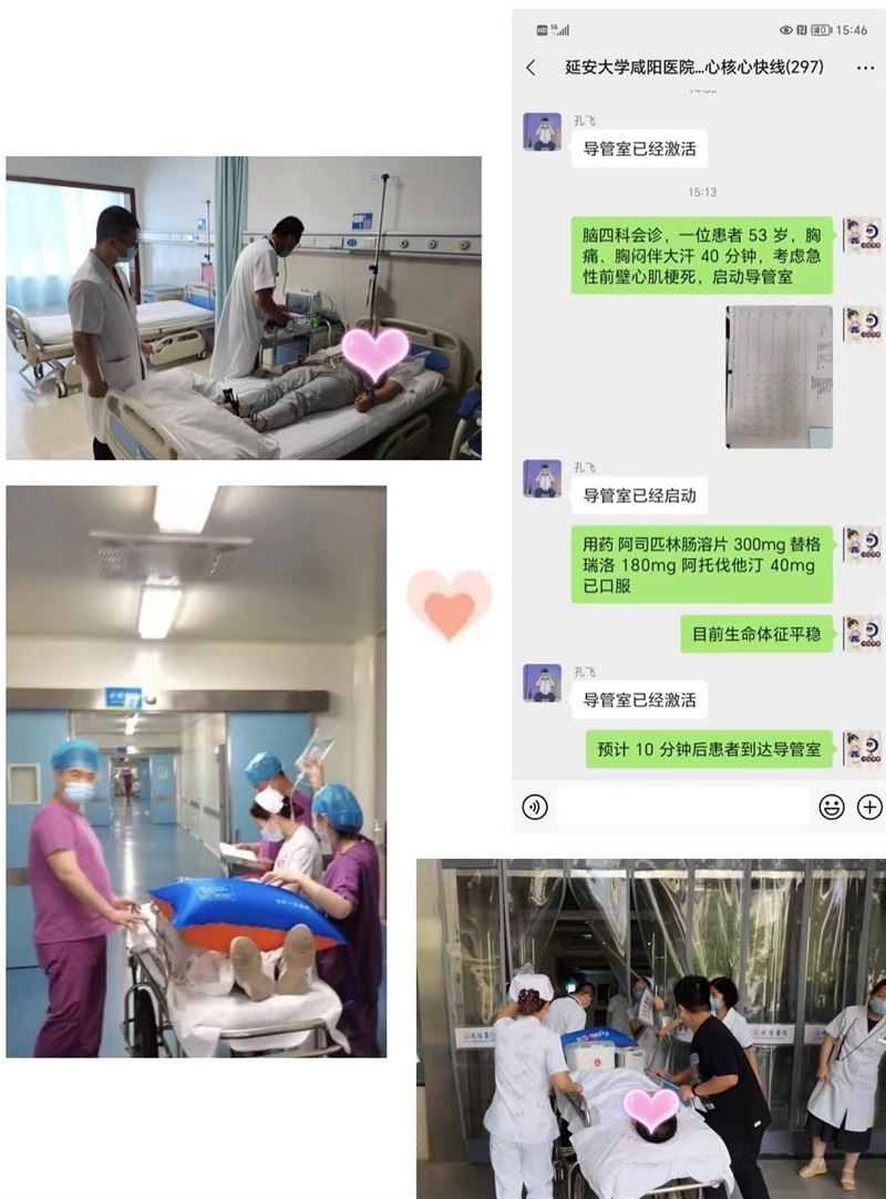 這邊的搶救剛剛結束,胸痛中心微信群再次閃動起來,院內發病急性心肌梗死患者救治應急演練開始了,神經內科四病區30床患者突發胸痛、胸悶、出汗,急查心電圖提示急性前壁ST段抬高心肌梗死,心內科會診醫師到達后評估患者病情,建議立即轉科行急診PCI,將患者病情及心電圖發送至胸痛中心微信群,并匯報胸痛二線,提前啟動導管室,與家屬溝通,告知病情并完成術前簽字,與神經內科醫師及護士攜帶急救藥品及監護儀、除顫儀,護送患者至4樓導管室完成急診PCI,將“患者”從生死邊緣拽了回來。