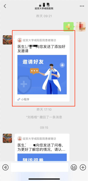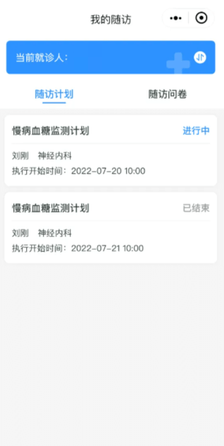 患者在接受邀請時,可選擇就診人。操作成功后,醫護人員即可在查看患者病情后制定針對性隨訪計劃。設置成功后,系統會自動運行,按照預設計劃對醫生進行電話隨訪提醒,對患者發送復診通知、換藥提醒、二次手術提醒、科普宣教資料、調查問卷等。