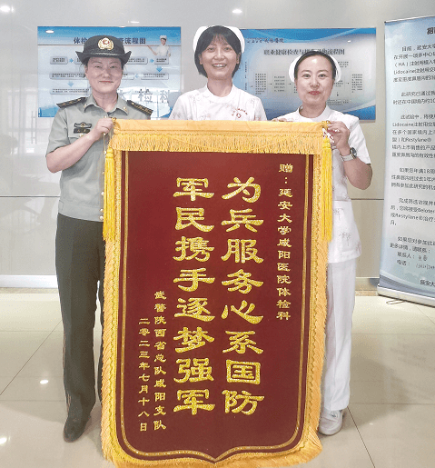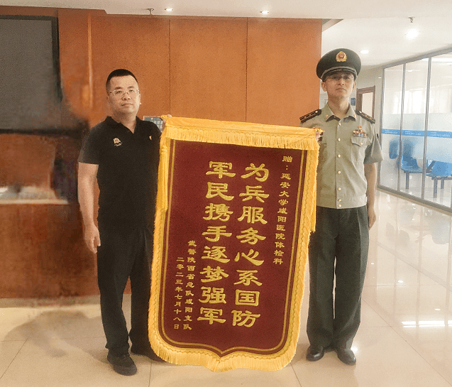 軍愛民,民擁軍,軍民關系魚水情。7月21日早晨,武警咸陽支隊中隊長把一面寫有“為兵服務心系國防,軍民攜手逐夢強軍”的錦旗送到了延安大學咸陽醫院體檢科主任手中,感謝延安大學咸陽醫院體檢科高質量的體檢服務和認真負責的檢查態度。這是體檢科再一次以優質的服務贏得客戶贊許,收到體檢客戶送來的感謝錦旗。