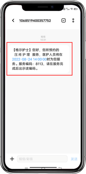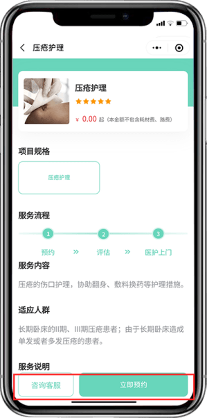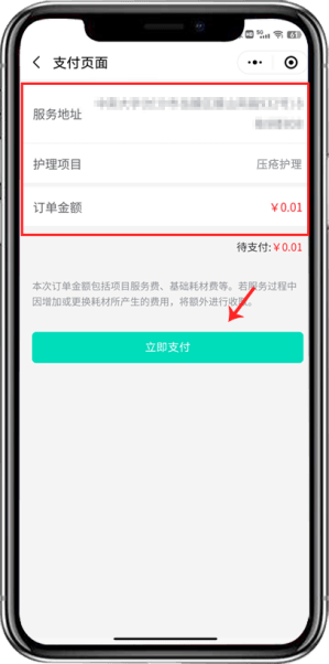 第六步:確認服務地址及護理項目后支付即可,等待護士聯系進行護理項目評估