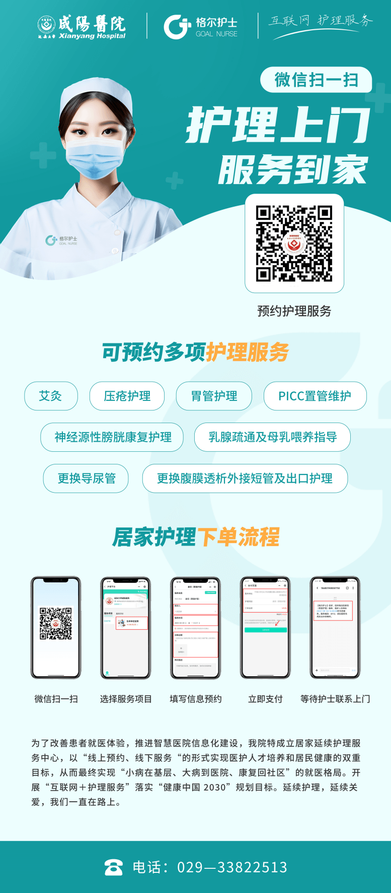 延安大學咸陽醫院方便、快捷的“護理上門”服務讓患者及家屬深受感動、連連稱贊。護理上門服務在進一步響應國家號召的同時,切實為患者及家屬排憂解難,護理人員用??频闹R、專業的技術,拉近醫院與家的距離,拉近醫護與患者的心。未來將在國家政策的指導下,全面推進“互聯網+護理服務”項目,提高護理質量,加強科學管理,切實改善患者的就醫體驗,促進醫療機構護理工作貼近患者、貼近臨床、貼近社會,人民群眾獲得感、幸福感、安全感進一步增強。