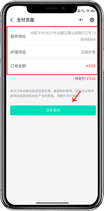 6、確認無誤后點擊支付,等待護士聯(lián)系進行護理項目評估
