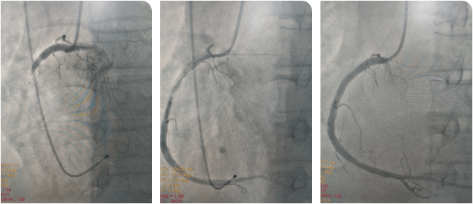 時(shí)間就是生命!心內(nèi)科介入團(tuán)隊(duì)與死神展開較量,大家輪流為患者進(jìn)行心肺復(fù)蘇,并以最快的速度完成消毒、鋪巾。患者大動(dòng)脈搏動(dòng)消失,李新國主任、吳利杰主任憑借扎實(shí)的基本功,盲穿腋靜脈及右側(cè)股動(dòng)脈,植入臨時(shí)起搏器。根據(jù)心電圖判斷罪犯血管為右冠狀動(dòng)脈,李新國主任果斷直接選擇右冠指引導(dǎo)管造影,造影證實(shí)判斷,右冠狀動(dòng)脈粗大,自近段完全閉塞。12:36介入團(tuán)隊(duì)將導(dǎo)絲送到了患者閉塞血管的遠(yuǎn)端,并用球囊對閉塞血管擴(kuò)張后順利恢復(fù)前向血流。奇跡出現(xiàn)了,患者微弱的心跳逐漸有力,血壓、心律也逐漸好轉(zhuǎn)。此時(shí)的患者仍處于昏迷狀態(tài),攜帶呼吸機(jī)及臨時(shí)起搏器轉(zhuǎn)入CCU病房繼續(xù)治療。