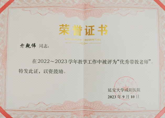 在醫院有這樣一群人,他們既是醫者,亦是師者。擁有雙重天職的他們,是白衣天使,用生命守護生命,更是紅燭人梯,用智慧啟迪心靈。他為人師表,言傳身教,高度敬業,嚴格要求,把良好的醫德醫風帶入教學工作中,實施教學人性化管理,及時予以關懷。亓乾偉時常告訴學生:作為一名合格的神經外科醫生需要具備諸多優良品質。一是要有扎實的基礎理論知識,同時在醫療外科方面具有較高的悟性(看到CT片或者磁共振片子以后腦海里要立即出現手術的切口大小,切口的深度),要有一雙精巧的手;二是要具有一顆一心為患者著想的仁心,不管是神經外科醫生還是其他科室從業者,面對備受疾病折磨的人群,都應該懷著一顆仁慈之心;同時還要有奉獻精神,神經外科手術一般都在3至4個小時,一些難度大的手術甚至十幾個小時,所以要想成為一名神經外科醫生奉獻精神是基本素養。最后要強調,神經外科的病人病情變化快,要有豐富的臨床經驗,學習與總結是不斷提升的基礎,只有不斷的提升自我才能擁有一雙慧眼,在第一時間發現患者病情。就這樣他帶出了一批又一批像他一樣品質卓越的年輕醫生,為科室及醫院的人才計劃以及梯隊建設做出巨大貢獻。獲得大家一致認可,并多次獲得院內頒發的優秀代教老師獎項。