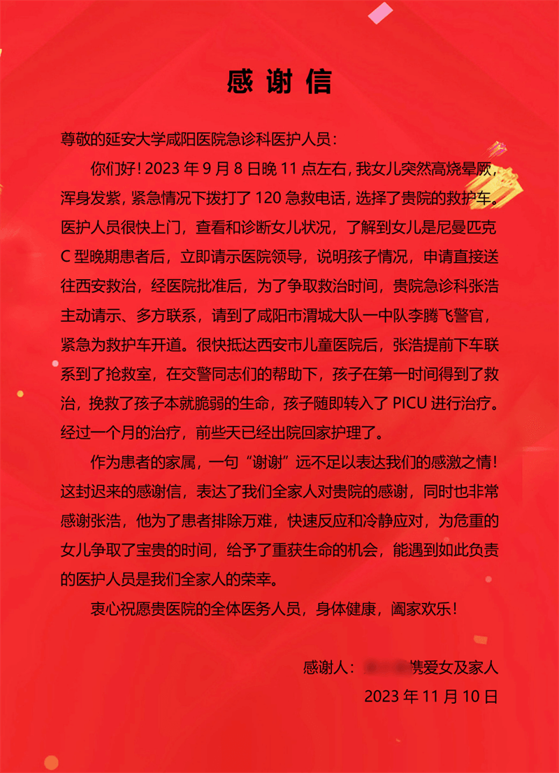 經過治療,患兒目前病情穩定,患兒家屬送來錦旗,連連道謝:“非常感謝貴院的全力救治,更要感謝急診醫學科護士張浩,他為了患者排除萬難,快速反應和冷靜應對,為危重的女兒爭取了寶貴的時間,給予了重獲生命的機會,能遇到如此負責的醫護人員是我們全家人的榮幸。”