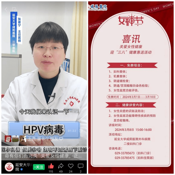 在第114個(gè)“三八”國(guó)際婦女節(jié)來(lái)臨之際,為了提高女性對(duì)自身健康的認(rèn)知,延安大學(xué)咸陽(yáng)醫(yī)院婦科于3月8日在外科病院二樓婦科門診隆重舉辦了“關(guān)愛(ài)女性,關(guān)注健康”為主題的科普活動(dòng)。本次活動(dòng)伊始前,科室通過(guò)制作主題海報(bào)、科普小視頻等方式進(jìn)行大力宣傳,使更多女性朋友了解相關(guān)健康知識(shí),并能及時(shí)獲取科普系列活動(dòng)的相關(guān)消息,為扎實(shí)開(kāi)展此次活動(dòng)奠定堅(jiān)實(shí)基礎(chǔ)。