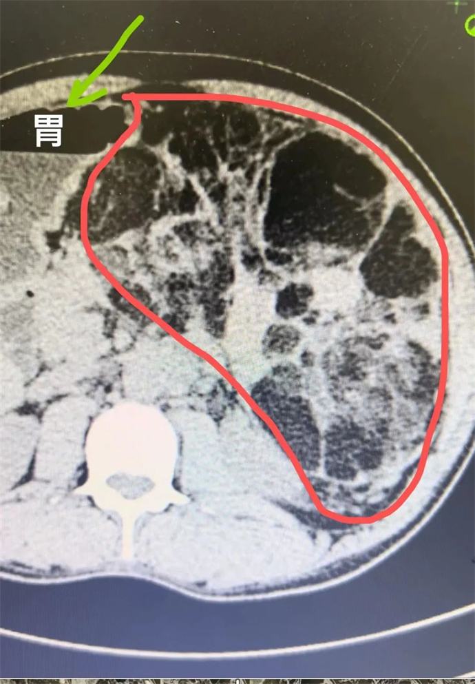 錯構瘤屬于良性腫瘤,絕大多數錯構瘤患者沒有明顯的癥狀,一些比較大的錯構瘤,可能會出現局部壓迫癥狀或壓迫周圍臟器,出現相應的癥狀。腎錯構瘤最大的危害在于,體積較大的錯構瘤突然破裂時,患者會出現腰腹疼痛和血尿等癥狀,嚴重的大出血患者可以在腹部觸及到包塊,甚至有休克癥狀。因此當腫瘤直徑大于4cm時,一般會積極建議手術,減少自發破裂的風險。但該患者平素未行體檢,腫瘤已近30cm,因此貿然手術處理存在巨大的風險。