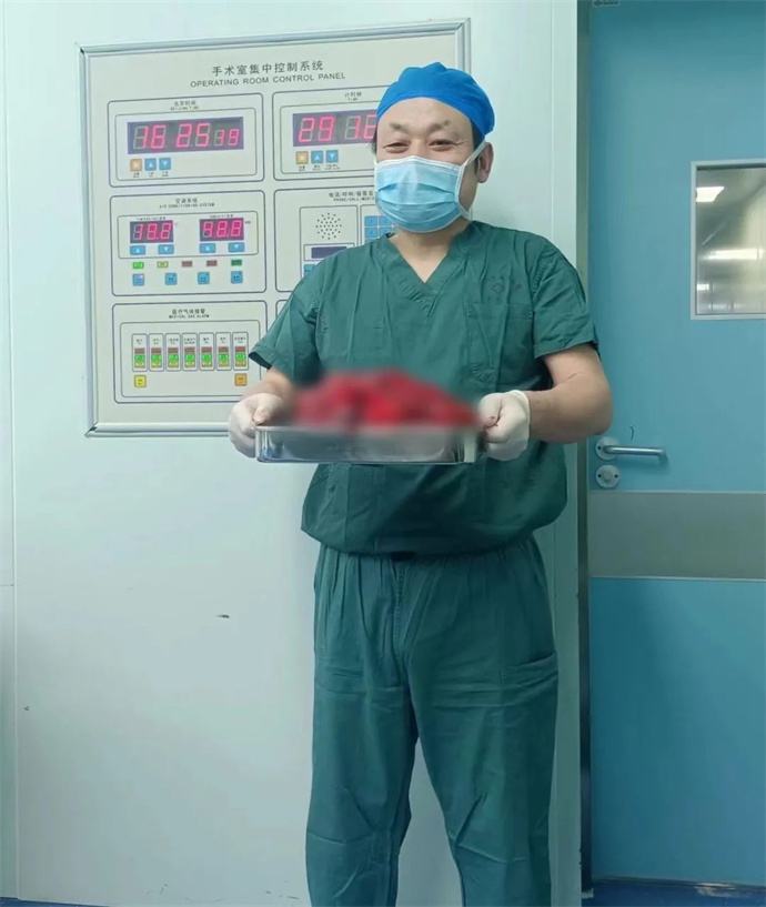強永春主任帶領泌尿外科團隊積極協調,提前預約腫瘤介入王忠主任,于術前行介入栓塞,減少術中出血風險;同時聯系輸血科提前術中備血;因腫瘤已侵及腎臟大部及腎臟血管,無法保留腎單位行腎部分切除,故先側臥位行后腹腔鏡下微創手術,游離并處理腎臟血管,確保切除時安全,再仰臥位行錯構瘤及腎臟切除;充分準備后,手術按預定方案如期進行,歷時6小時,成功拆除“定時炸彈”。目前患者已出院恢復了日常工作。