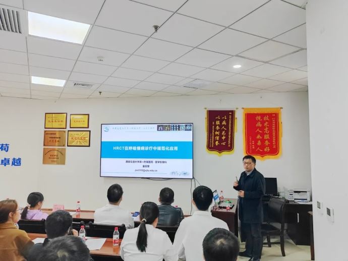 下午三點(diǎn)半,會(huì)議正式開始,張濤副主任致歡迎辭,并隆重介紹金晨望教授及其團(tuán)隊(duì)。隨即,金晨望教授就“HRCT在呼吸慢病診療中規(guī)范化應(yīng)用”進(jìn)行深入淺出地講授,首先對(duì)HRCT的概念進(jìn)行了基礎(chǔ)的講解,金晨望教授指出呼吸慢病目前已成為重大的公共衛(wèi)生問題,而HRCT的應(yīng)用,可以盡早篩查此類疾病,做到早發(fā)現(xiàn)、早治療。接著又通過實(shí)際病例,對(duì)間質(zhì)性肺疾病等進(jìn)行了系統(tǒng)的講解,展示了“蜂窩征”的演變過程及相應(yīng)CT表現(xiàn),對(duì)間質(zhì)性肺異常的三種類型的不同影像表現(xiàn)及其鑒別診斷做了詳細(xì)的闡述。最后,向我們介紹了目前HRCT在呼吸慢病中的臨床應(yīng)用,并展示了金晨望教授團(tuán)隊(duì)在此方面取得的豐碩的成果。