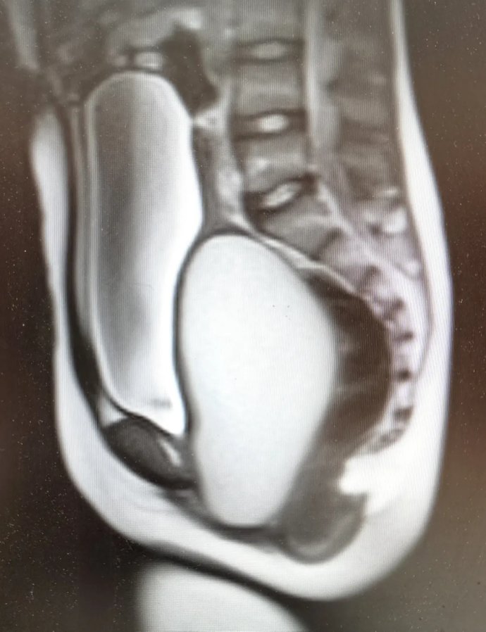 12歲花季少女出現周期性下腹痛,在其父母帶領下先后就診咸陽市兩家醫院,最終,她們選擇了延安大學咸陽醫院婦科。就診當日,趙倩蘭主管醫生詳細追問病史,患者自訴已間斷性下腹痛3月余,本次腹痛較前明顯加重,腹痛難忍。入院后醫生立即為其安排了婦科彩超及盆腔磁共振,發現該患者宮腔、宮頸及陰道上段充滿大量積血,積液壓迫膀胱及直腸,導致排便、排尿障礙。張素寧主任為其查體后發現,該患兒陰道竟無開口,導致經血無法排出,閉鎖處無隆起,無青紫,排除處女膜閉鎖,直腸檢查發現陰道上端有一包塊凸向直腸,包塊下緣距離肛門口約4-5cm,結合查體及相關輔助檢查,考慮該患者為陰道閉鎖,值得慶幸的是該患者其他系統暫未發現畸形。