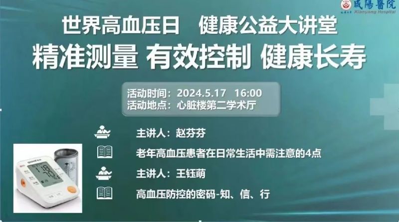 5月,初夏的季節,陽光溫暖而不熾熱,在第20個“世界高血壓日”來臨之際,5月17日,延安大學咸陽醫院心血管病院舉辦以“精準測量,有效控制,健康長壽”為主題的高血壓義診與健康科普活動。此次活動旨在提高公眾對高血壓這一“隱形殺手”的認識,通過精準的血壓監測和科學的生活方式指導,有效控制血壓,促進健康長壽。